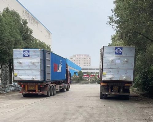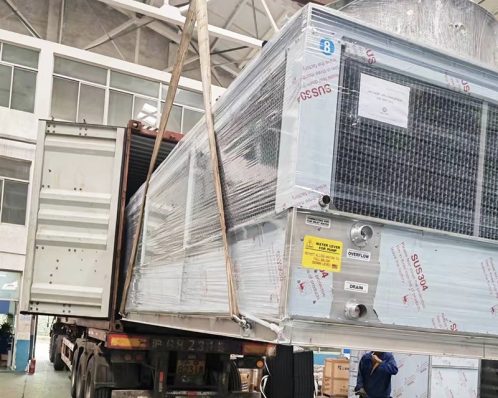 - Dàn ngưng được cung cấp ở dạng hoàn chỉnh lắp trên khung bệ vững chắc và được chia làm 2 phần để có thể dễ dàng lắp đặt. Dàn ngưng được trang bị đầy đủ các quạt, bơm, bộ phận phân phối nước (eliminator), thùng chứa nước có van phao khống chế mức nước.